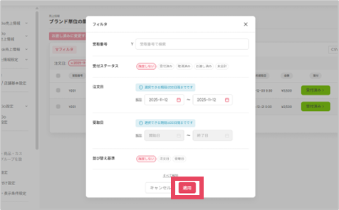操作手順 ①[O:der ToGo売上情報]をクリックし[ブランド単位の集計]をクリック ②確認したい日付を入力 ・カレンダーで日付指定する場合 カレンダーマークをクリックし表示されるカレンダーで日付が選択できます。 ③その他の条件でデータを絞り込む ・伝票番号、受取番号から検索 伝票番号は19桁、受取番号は3桁全て入力してください。 ・電話番号、伝票ステータスから検索 ↓ [フィルタ]をクリックし、検索条件を設定したら、最後に[適用]をクリックします。 ...