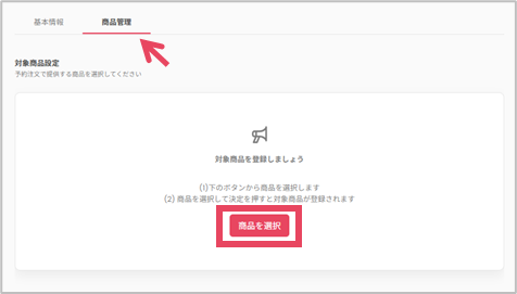「商品管理」のタブを選択し、[商品を選択]をクリックすると対象商品が設定できます。