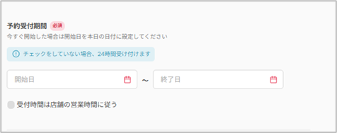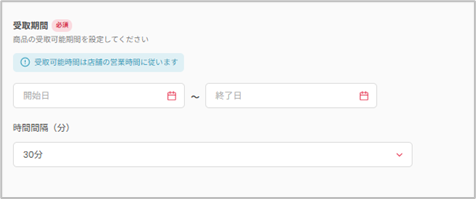 予約を受け付ける期間を設定します。予約を受け付ける期間と受取期間の重複はできません。